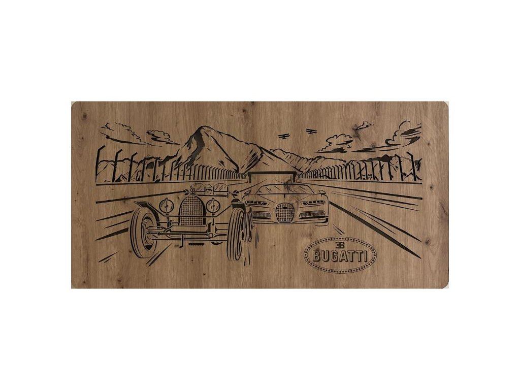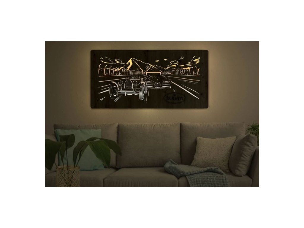 LED obraz Bugatti v rozmere 100×50 cm zachytáva výnimočný moment: legendu minulosti bok po boku s ikonou dneška. Drevený podsvietený obraz športového auta stelesňuje evolúciu dizajnu, rýchlosti a prestíže – od prvých kabrioletov až po nadčasové hyperautá. Jemné LED podsvietenie zdôrazňuje detaily oboch vozidiel a premení každú stenu na výstavný priestor pre skutočných fajnšmekrov.
