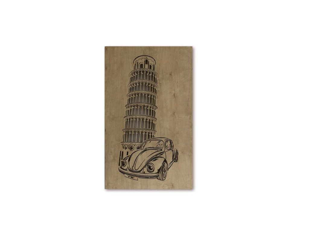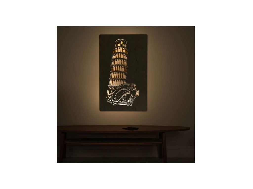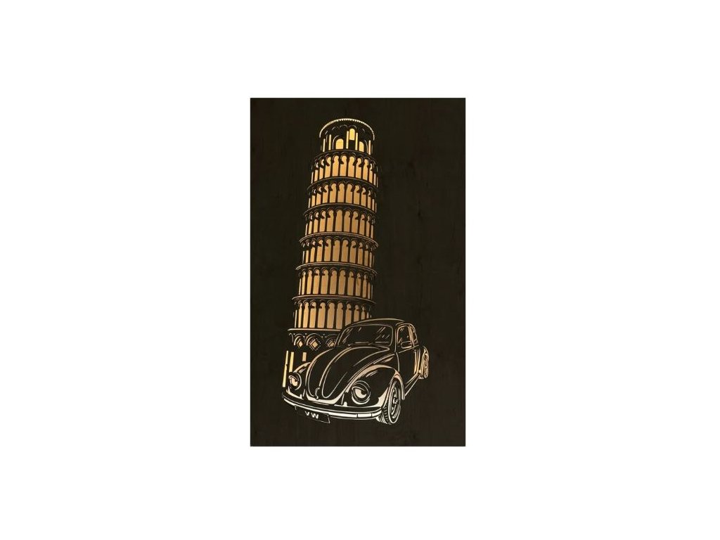 LED obraz VW Beetle pri Šikmej veži s rozmermi 80×50 cm je vizuálnou poctou dvom ikonám – legendárnemu autu a nezameniteľnej siluete talianskej pamiatky. Drevený podklad, precízne spracovanie a jemné LED podsvietenie premieňajú obraz na štýlový záber z výletu, ktorý môže trvať večne.