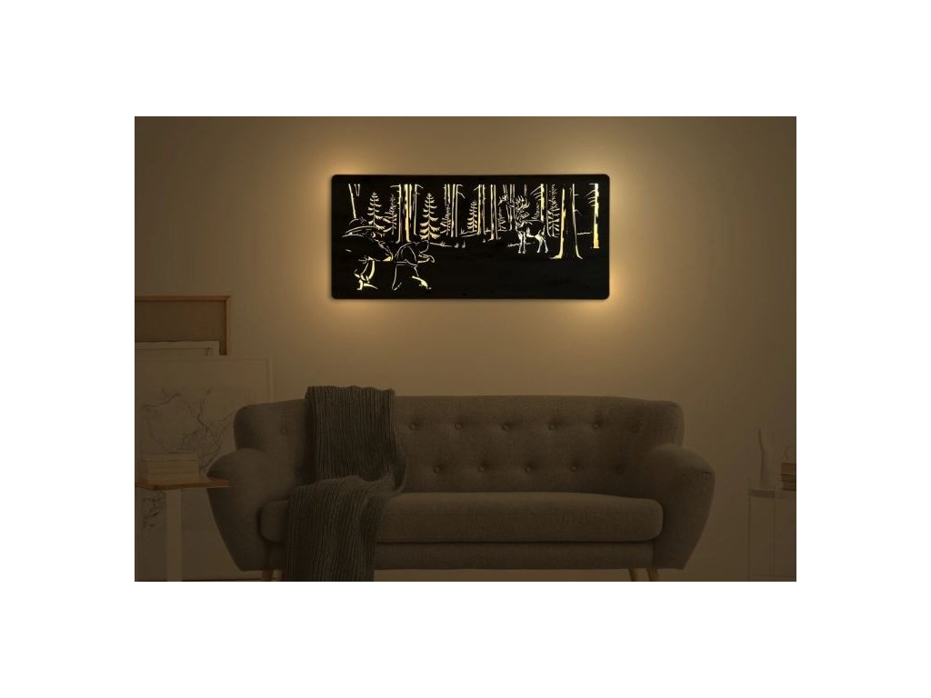 LED obraz jeleň a poľovník vytvára útulnú atmosféru a zároveň slúži ako výrazný dekoratívny prvok. Kvalitné spracovanie a originálne línie z neho robia svietiaci obraz, ktorý osloví každého milovníka lesa a autentického štýlu.