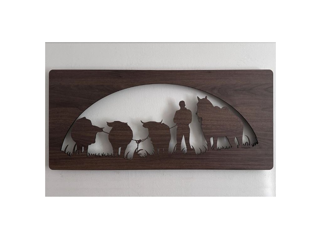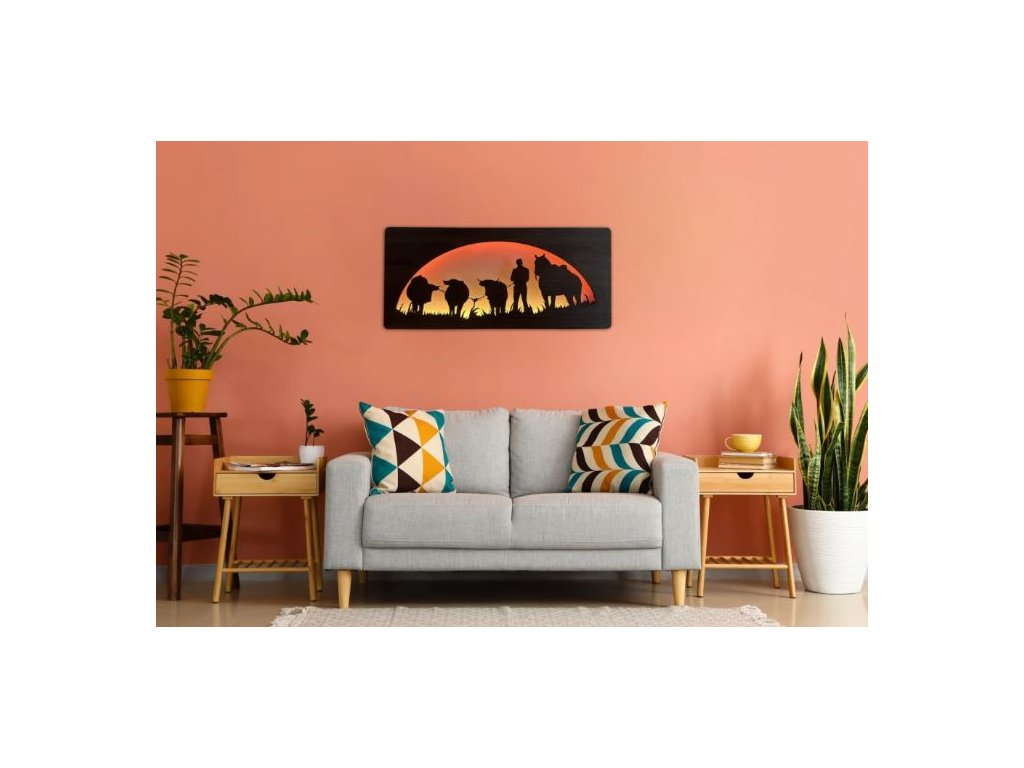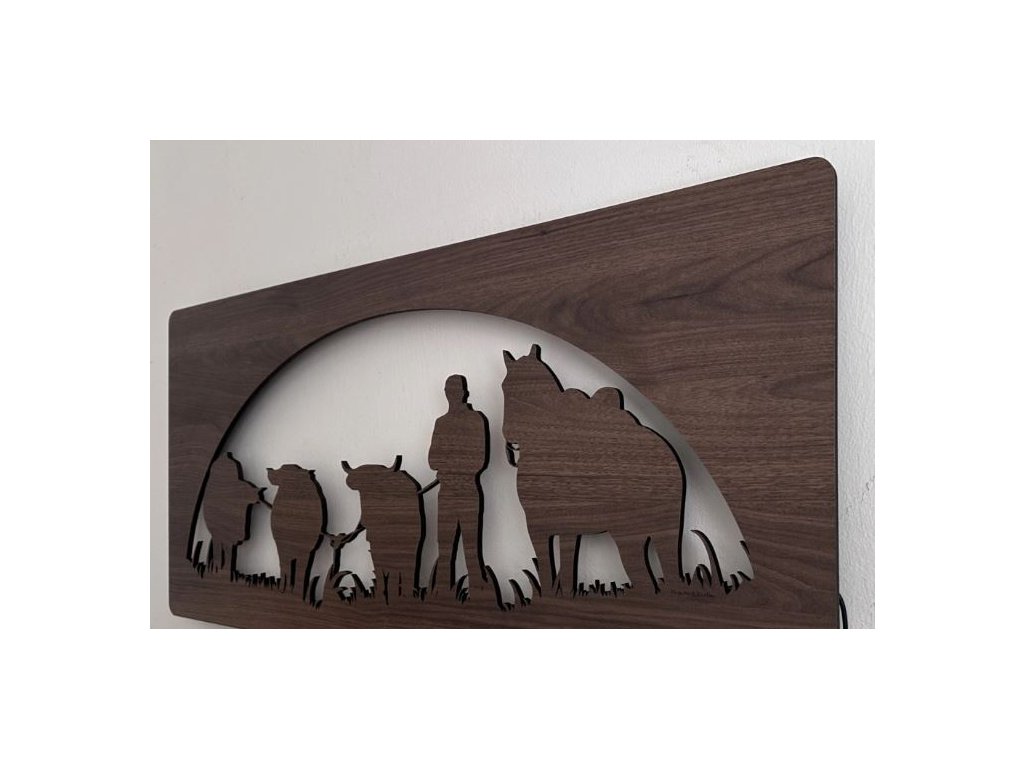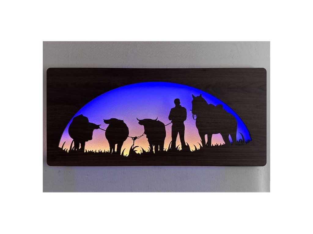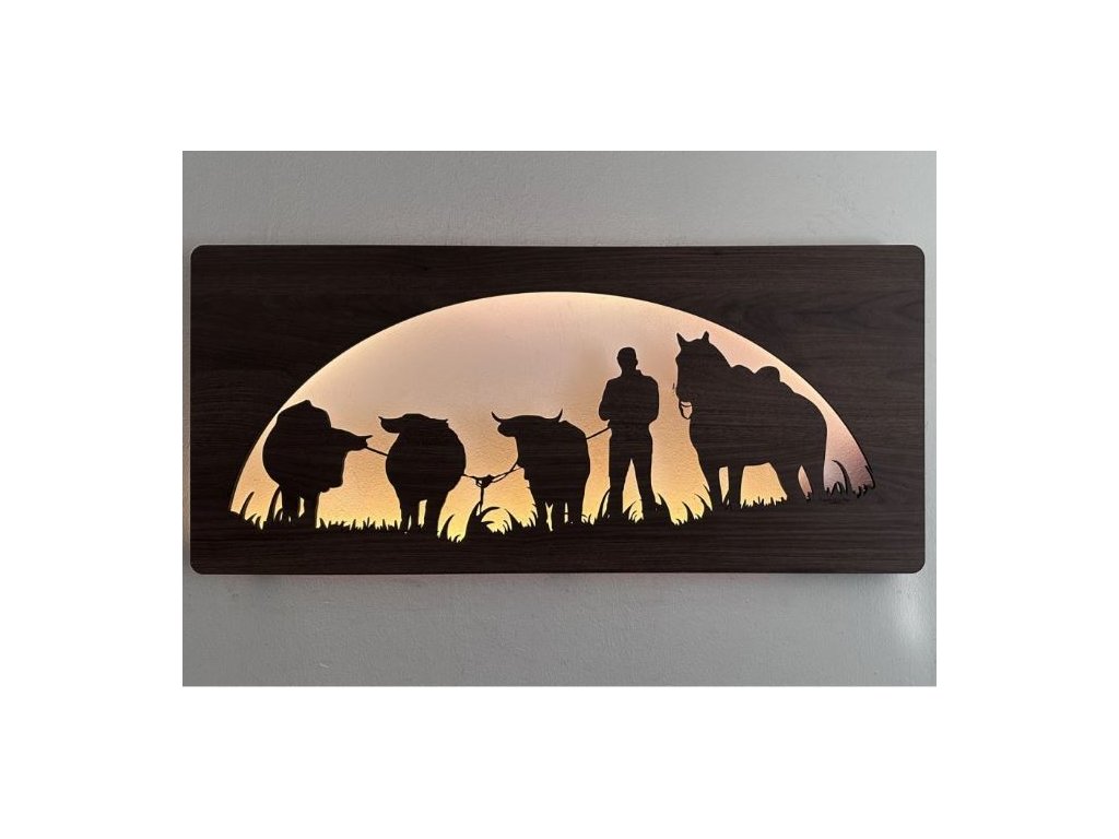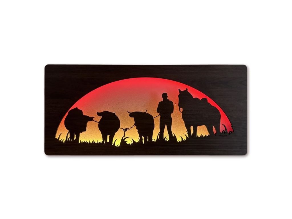 Drevený obraz Kôň a býk s LED podsvietením v rozmere 100x50 cm predstavuje výnimočný dizajnový prvok, ktorý spája silu prírodných motívov s modernou technológiou osvetlenia. Tento svietiaci obraz s koňom a býkom je vyrobený z kvalitného dreva a doplnený o RGBW LED podsvietenie, vďaka čomu dokonale vynikne na stene každej miestnosti.