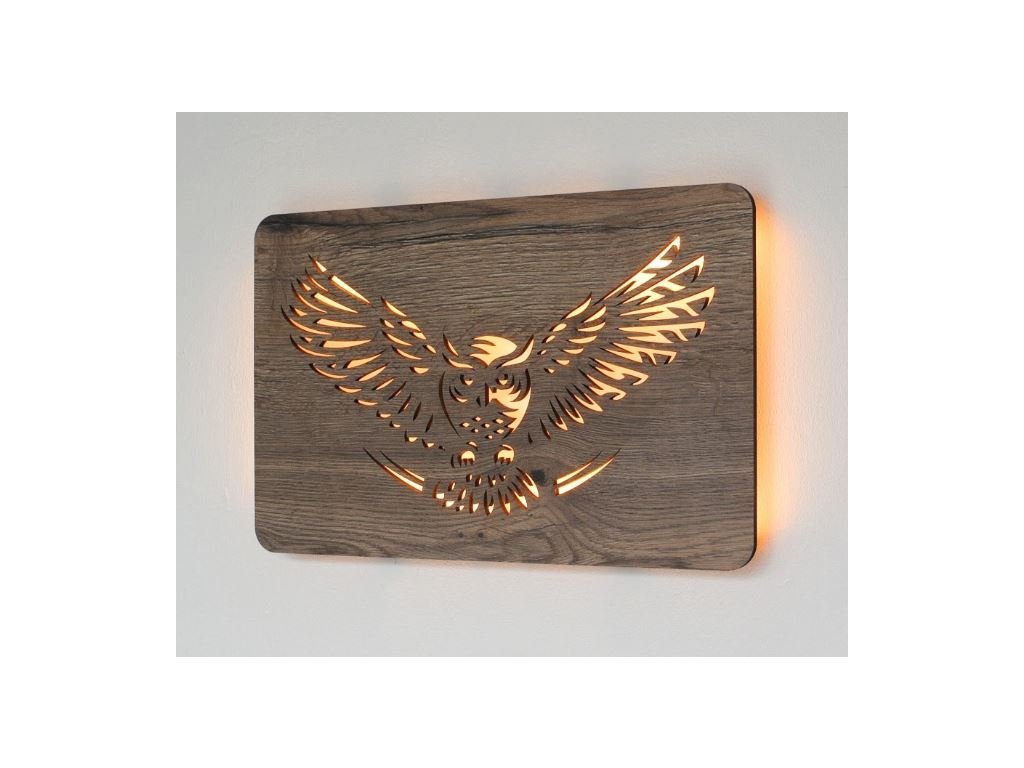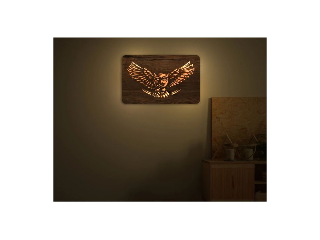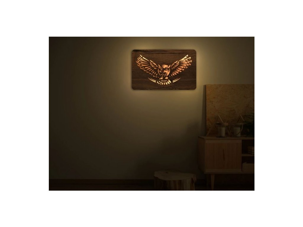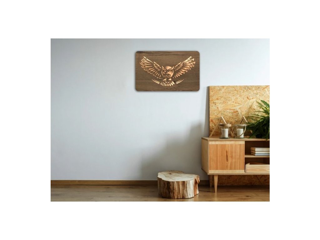 Drevený obraz Sova s LED podsvietením 62x38 cm je elegantným stvárnením múdrosti a tajomna. Tento LED obraz sova je vyrezaný do dreva s precíznosťou a doplnený o svetelné akcenty, ktoré zvýrazňujú každý detail.